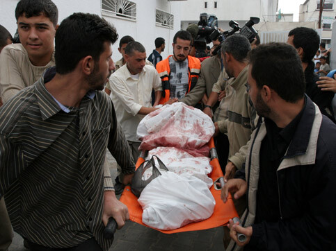 Employees at Adwan Hospital in Beit Lahiya carry a body of a Palestinian killed during an Israeli army operation in Beit Hanoun in the northern Gaza Strip, 1 November 2006. (MaanImages/Wesam Saleh)