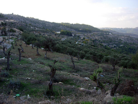 We went back up to the car and found our way back to the Jerusalem-Hebron Road past Rachel’s Tomb, but to get to Hebron we made a right at Bab Al-Zaq and headed to Beit Jalla instead of going straight. There was no way to stay on this road as it was cut off again before Deheishe Camp. We stopped at the top of Beit Jalla to see the olive trees the Israelis had chopped down. This marks the route of the wall as it snakes its way up here. All of Beit Jalla’s agricultural lands will be on the other side cut off from her people. The next time I stand here I will not be able to see this vista; I will only see grey concrete. (Emily Jacir)