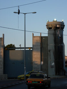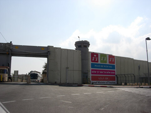 After passing through the first checkpoint, we made a right and we were able to enter Bethlehem through the large gate. You can see a tourist bus on its way out exiting the city. Palestinian ID holders cannot enter or exit from here. (Emily Jacir)