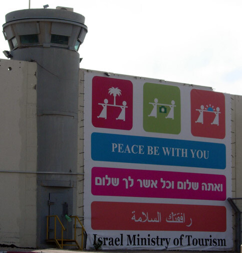 The Israeli Ministry of Tourism hung up a poster about “peace” on the wall which has turned the city of Bethlehem into a ghetto. (Emily Jacir)
