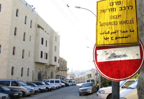 A sign warning against “unauthorized” vehicles in front of Shuhada Street. In Tel Rumeida only Israeli settlers and soldiers are allowed to drive while cars belonging to Palestinians are not even allowed in. (Anna Baltzer)
