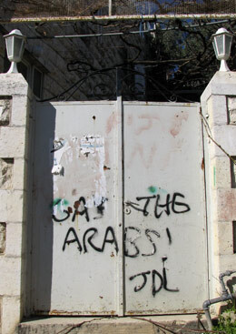 Settler graffiti reading “Gas the Arabs!”, spray-painted on the doors of a local Palestinian home. (Anna Baltzer)
