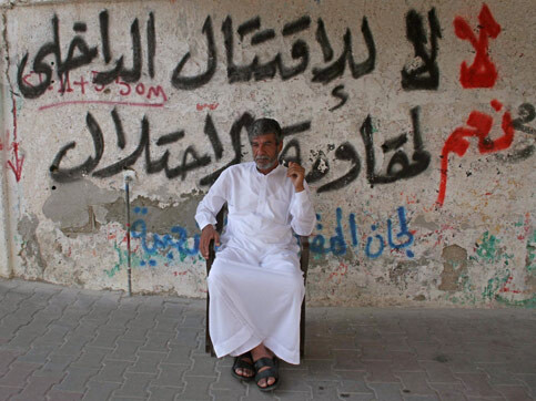 In Rafah in the southern Gaza Strip, a man sits next to a wall that reads in Arabic, “No to internal fighting. Yes to fighting the occupation.” 16 June 2007. (Hatem Omar/MaanImages)