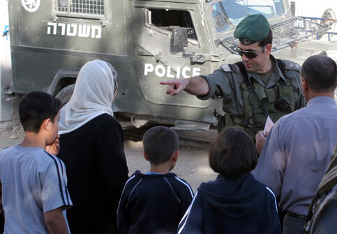 ISRAELI POLICE STATE: So-called Israeli democracy keeps tight control over Palestinians in the occupied territories. Here a border policeman argues with Palestinians at the main checkpoint between outside Bethlehem denying them entrance to the holy city of Jerusalem to celebrate the Islamic holiday of Leilat al-Qadr, 18 October 2006. (Magnus Johansson/MaanImages)