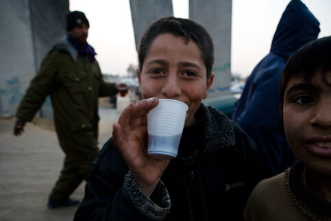 Breaking the siege: A young Palestinian boy from Rafah, Gaza enjoys a cup of tea in front of the fallen wall at the border with Egypt. (Matthew Cassel)