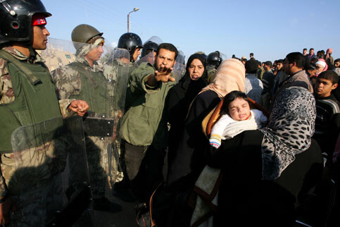 Egyptian border guards prevent Palestinians from crossing into Egypt from the southern Gaza Strip, 25 January 2008. (MaanImages)