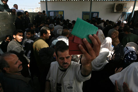 Due to the ongoing Israeli siege, the majority of Palestinians in Gaza have become dependent on aid. Here a Palestinian man raises his IDs as him and others wait to receive rations at UNRWA distribution center in the Gaza Strip, 6 March 2008. (Wissam Nassar/MaanImages)