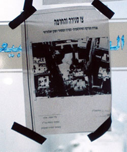 A closure and seizure order issued by the Israeli military posted on an office in a building rented out by the Islamic Charitable Society in Hebron. (Shabtai Gold/IRIN)