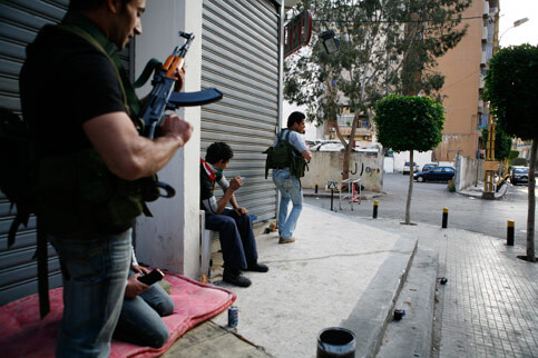 Fighters from the opposition-aligned Amal movement take position against pro-government fighters from the Future movement in Beirut’s Mezraa neighborhood, 8 May 2008. (Matthew Cassel)