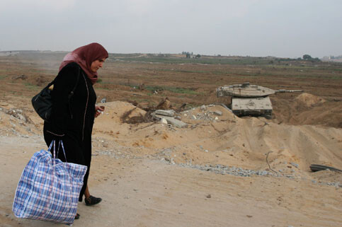 Two peoples, one ruler: a Palestinian woman walks past an Israeli tank, Gaza Strip, July 2007. (Wissam Nassar/MaanImages)