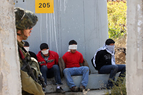 An Israeli soldier stands by blindfolded students from the Palestine Technical College in the Arroub refugee camp, 30 October. (Mamoun Wazwaz/MaanImages)