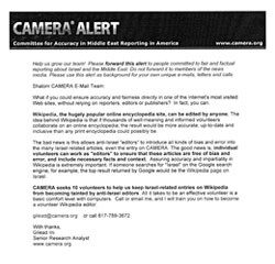 A 13 March action alert signed by Gilead Ini, a “Senior Research Analyst” at CAMERA, calls for “volunteers who can work as ‘editors’ to ensure” that Israel-related articles on Wikipedia are “free of bias and error, and include necessary facts and context.” However, subsequent communications indicate that the group not only wanted to keep the effort secret from the media, the public, and Wikipedia administrators, but that the material they intended to introduce included discredited claims that could smear Palestinians and Muslims and conceal Israel’s true history.