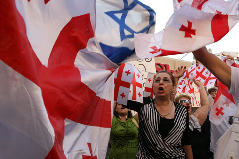 Israelis wave both Georgian and Israeli flags as they chant anti-Russian slogans during a demonstration outside the Russian embassy in Tel Aviv, 11 August. (Gali Tibbon/AFP/Getty Images)
