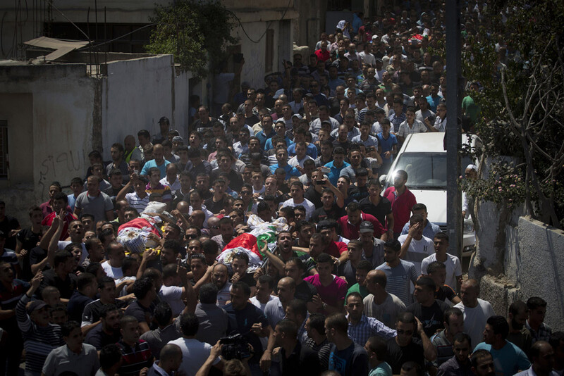 The funeral of three young men who were killed by Israeli forces in Qalandiya refugee camp, 26 August.