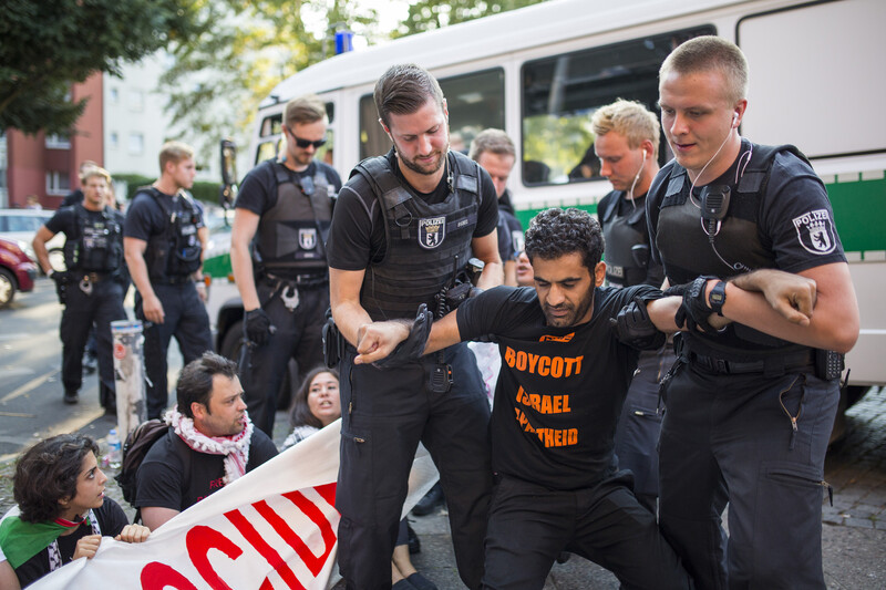 The video above shows police forcibly removing the peaceful protesters as they shout “Racists get out of Germany” and “Boycott Israel.”