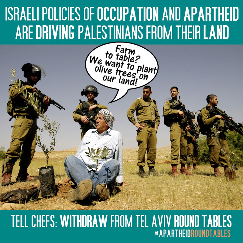 Activists are urging people to contact the chefs who are still heading for Tel Aviv and are encouraging the use of the hashtag #ApartheidRoundTables.