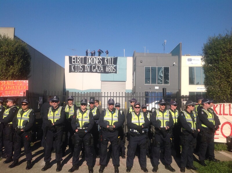 In August 2014, during Israel’s 51-day assault on Gaza that killed more than 2,200 Palestinians, activists from the Melbourne Palestine Action Group locked down an Elbit Systems factory in the suburb of Port Melbourne, occupied the building’s roof and displayed a banner reading “Elbit drones kill kids in Gaza.”