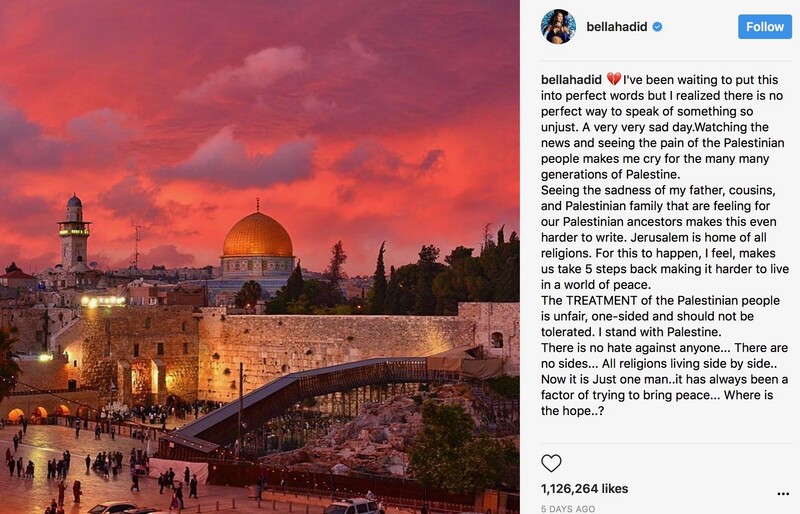 “Seeing the sadness of my father, cousins and Palestinian family that are feeling for our Palestinian ancestors makes this even harder to write,” Hadid added.