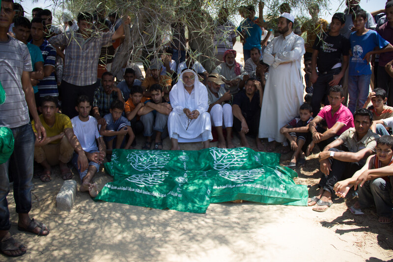 Palestinians attend the funeral of 26 members of the Abu Jame family who were killed the previous day during an Israeli attack on Khan Younis, Gaza Strip, 21 July 2014.