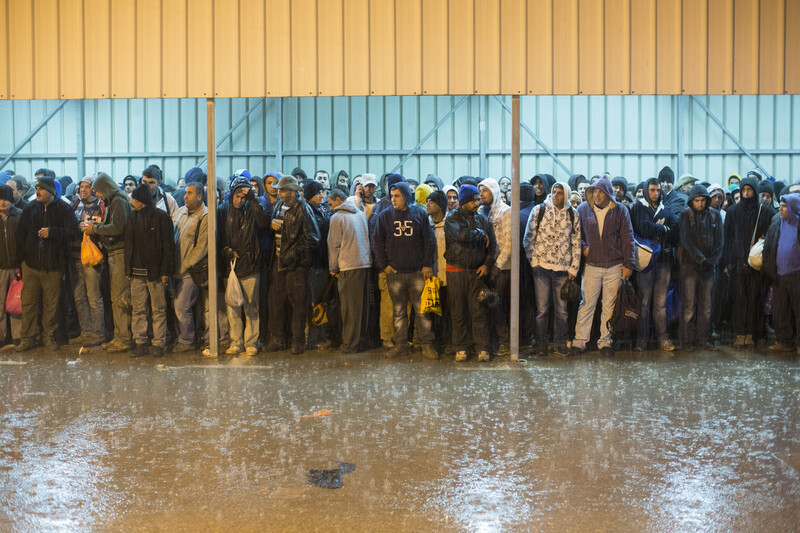 Palestinian workers holding Israeli work permits take cover from the rain after crossing the Eyal checkpoint between the occupied West Bank city of Qalqilya and present-day Israel, 4 January 2015.