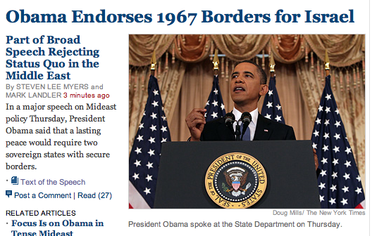 “Obama Endorses 1967 Borders for Israel” as part of a “Broad Speech Rejecting Status Quo in the Middle East” – that was the instant spin on the front of The New York Times website within minutes of the president speaking.