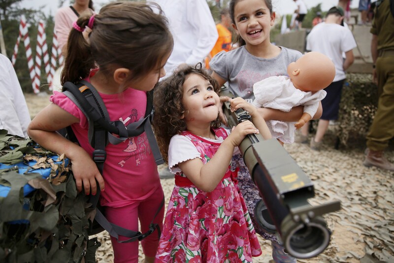 An Israeli child holds a rocket launcher as another holds her doll during a traditional military weapon display to mark the 66th anniversary of Israel’s “independence” at the occupied West Bank settlement of Efrat on 6 May 2014.