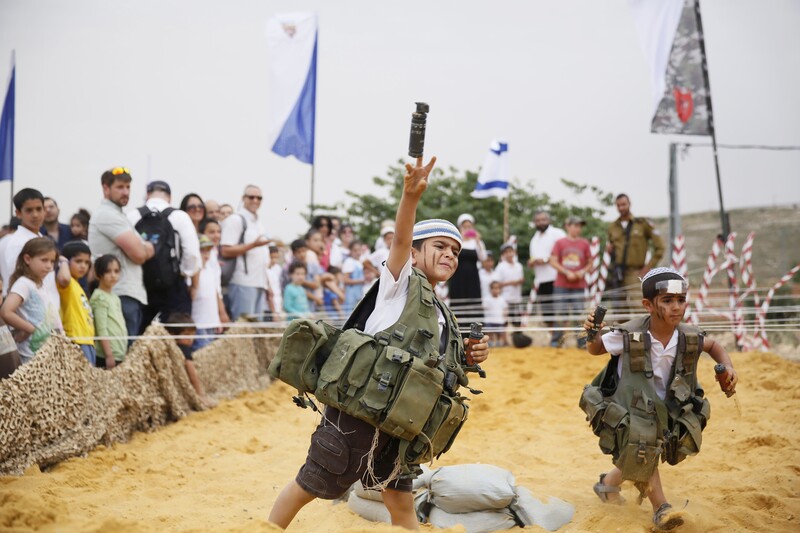 An Israeli boy wearing a military vest throws a mock grenade during a traditional military weapon display to mark the 66th anniversary of Israel’s “independence” at the occupied West Bank settlement of Efrat on 6 May 2014.
