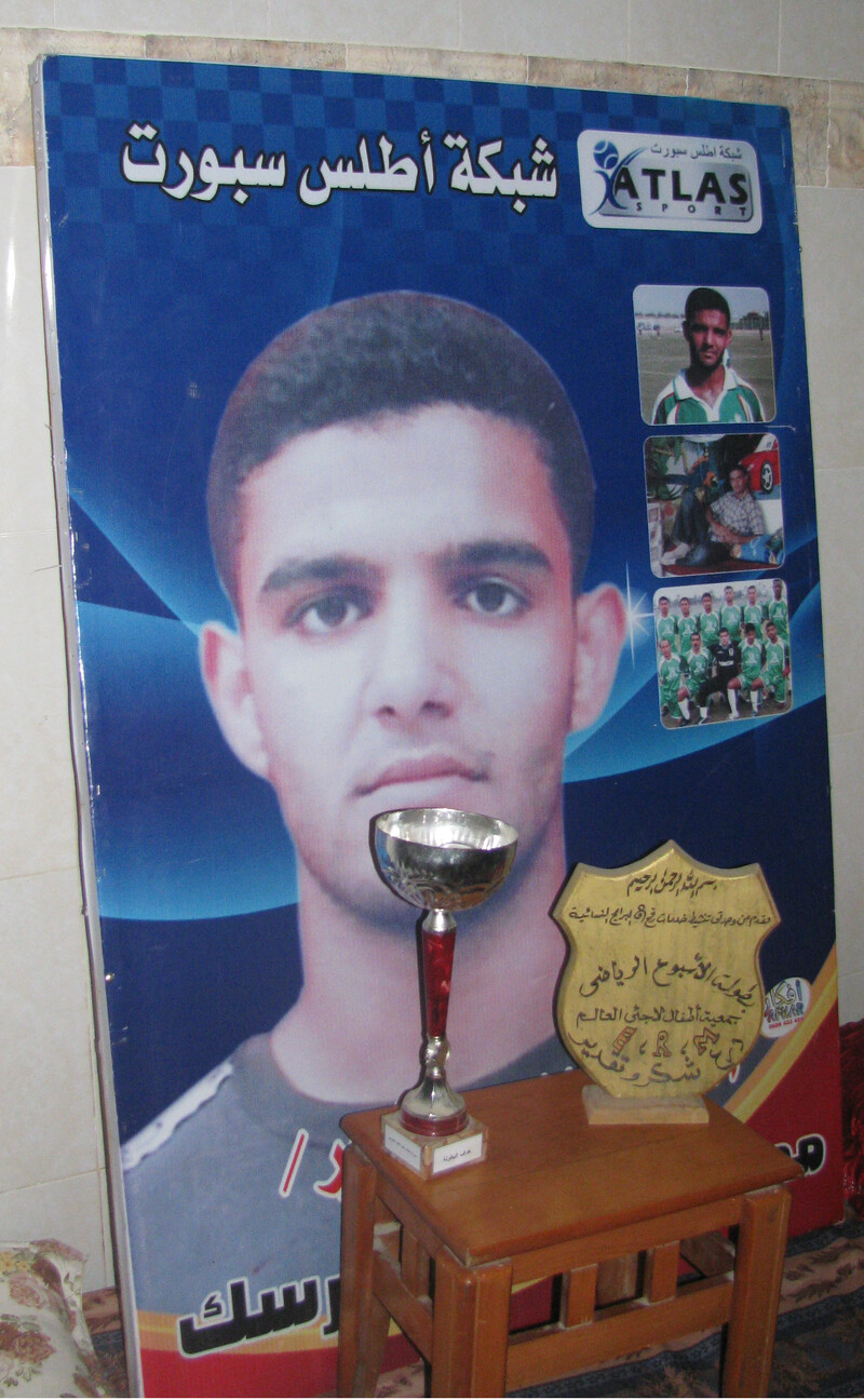 A poster of Mahmoud Sarsak, and some of his athletic trophies.