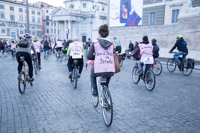 Cyclists in Rome take part in a 26 November bike rally to protest the staging of the 2018 Giro d’Italia race in Israel, which activists say is part of an effort to whitewash crimes against the Palestinians.
