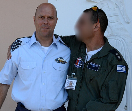An image posted by the Israeli air force shows an Israeli pilot embracing a Greek colleague. The Israeli’s face is obscured in the original.