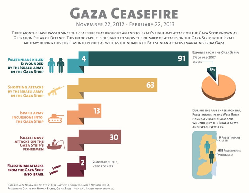 As this graphic, made by Ben White and Rachele Richards using UN data in early 2013, shows, Israel’s gross violations of the ceasefire began immediately. “Ceasefire” meant, in practice, that the Palestinians ceased fire while Israel continued to attack, invade and kill.