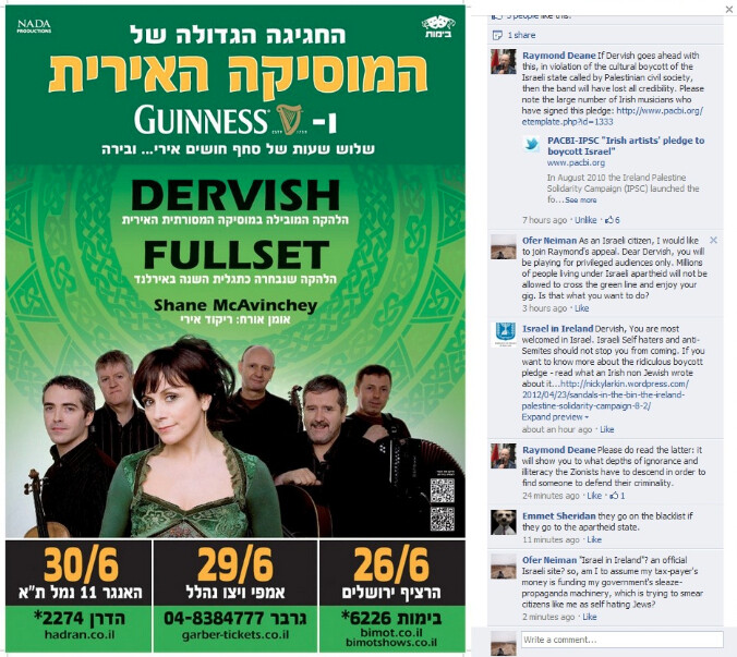 As the now successful campaign to urge Dervish to respect the cultural boycott proceeded, the Israeli embassy in Dublin hit back. On its Facebook page, it called Israeli citizens and others who urged respect for the boycott “Israeli self-haters and anti-Semites,” as a screen capture shows.