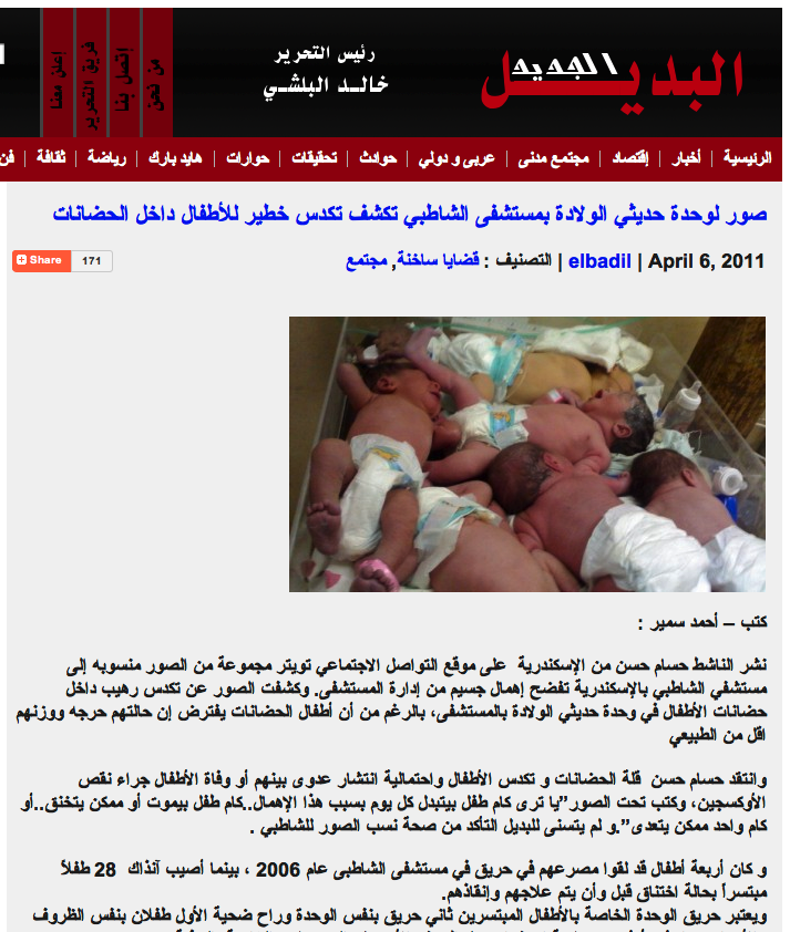 al-Badil al-JadidThe image apparently first appeared on the website of the Egyptian newspaper al-Badil al-Jadid in two stories on 6 April and 7 April about overcrowding and poor conditions in the maternity ward of the al-Shabti hospital in Alexandria.