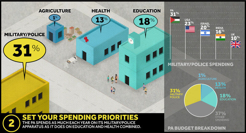 Editor’s note: An earlier version of panel 2 said that the PA spends more on military/police than on health, agriculture and education combined. A corrected panel, provided by Visualizing Palestine, has been inserted. It states that the PA spends as much on military/police as on health, agriculture and education combined.