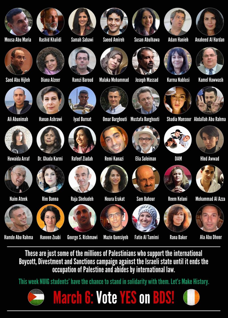NUI Galway’s Palestine Solidarity Society responded with the graphic above highlighting the broad support for BDS – a Palestinian-initiated campaign – among Palestinians themselves.