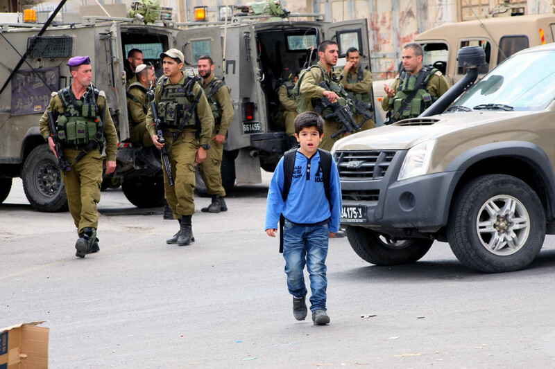A Palestinian schoolboy walks in front of Israeli occupation forces in the West Bank city of Hebron on 24 September 2013.