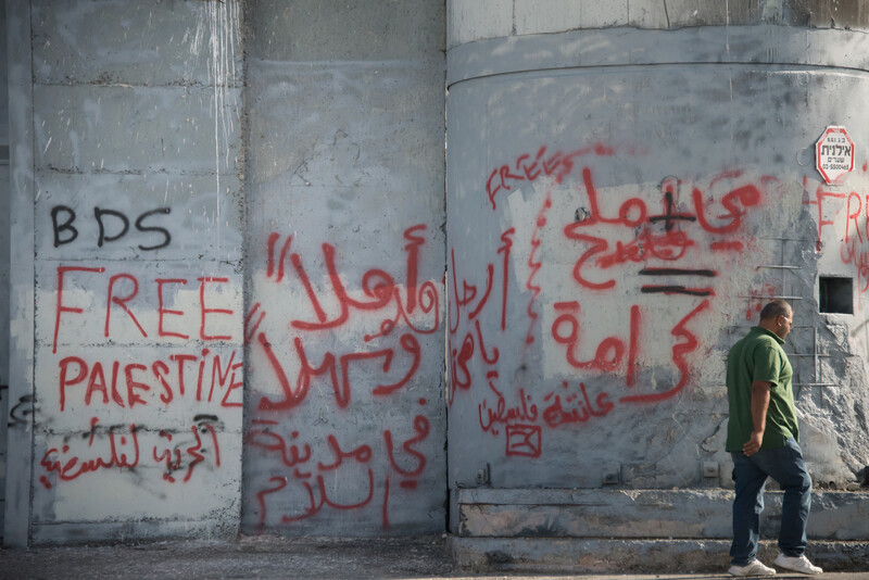 Graffiti on the Israeli-built wall dividing the occupied West Bank city of Bethlehem promotes the BDS — boycott, divestment and sanctions — movement.