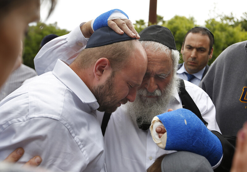 Rabbi Yisroel Goldstein, center, meets with members of the congregation of the Chabad Jewish community center, the day after a deadly shooting took place there, on Sunday, 28 April 2019, in Poway, California. Goldstein was shot and lost a finger on his right hand.