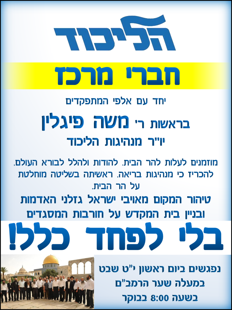 Chairman of the Likud LeadershipAre invited to make aliyah to [go up] the Temple Mount. To thank and praise the Creator of this World. To declare that healthy leadership. [sic] Its beginning is in the complete control of Temple Mount.