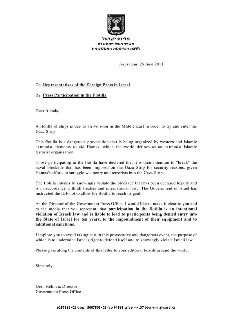 On 26 June, the director of the Israeli Government Press Office (GPO) Oren Helman issued a warning to the foreign press corps that participation by any journalists in the flotilla would violate Israeli law.