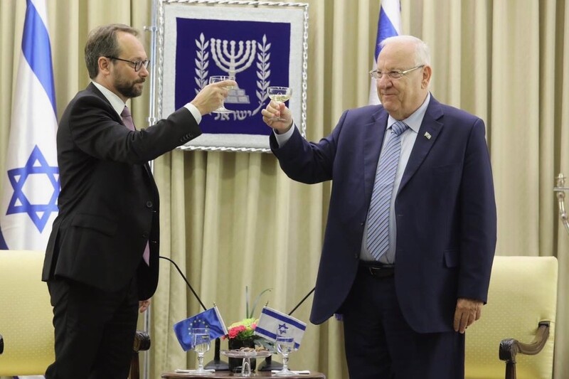EU Ambassador Emanuele Giaufret, left, raises a glass with Israeli President Reuven Rivlin in October. (via Facebook)