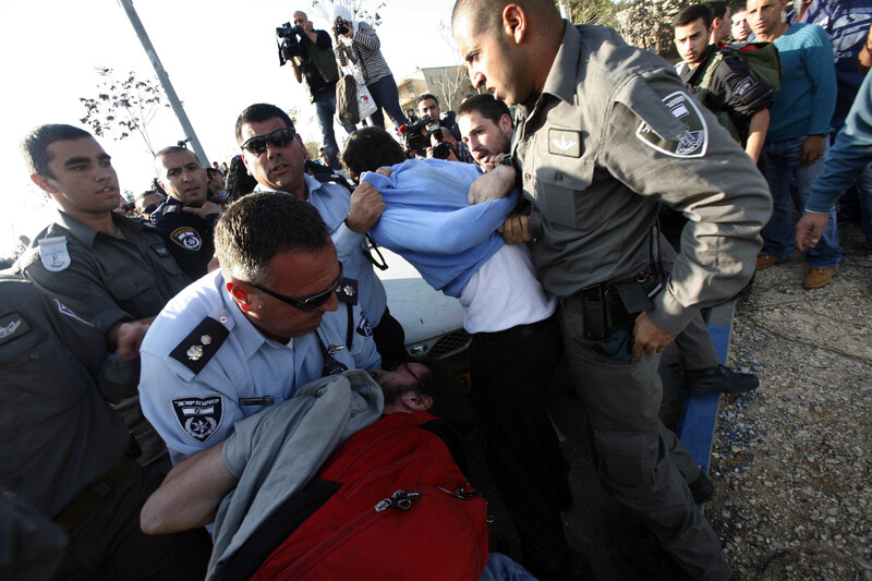 Israeli forces arrest protesters during a solidarity demonstration with Gaza, 20 November 2012.