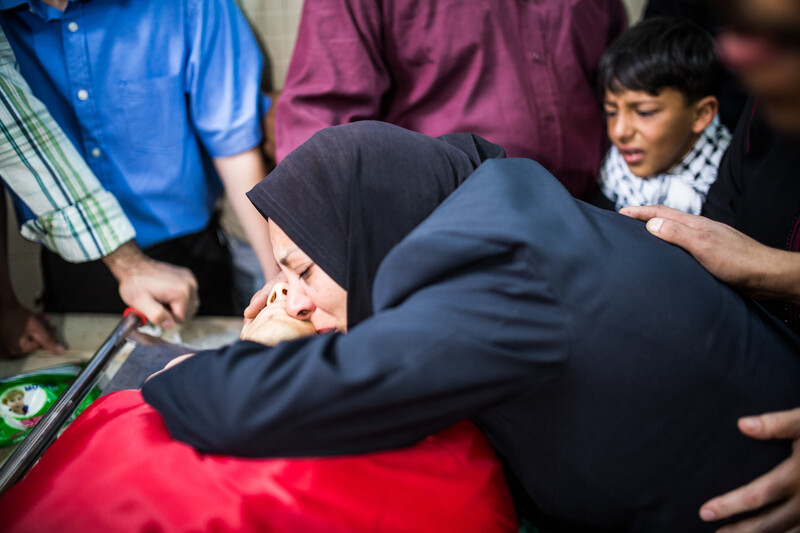The mother of Nadim Nuwara mourns over her son before his funeral in the occupied West Bank city of Ramallah on 16 May.