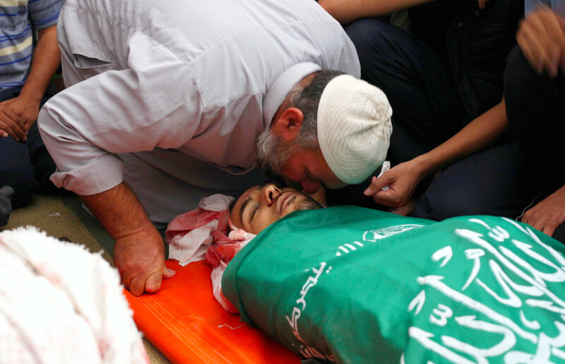 A mourner kisses the forehead of Saddam Abu Muamer, who was killed in an overnight Israeli airstrike on a house in Gaza’s Khan Younis, 14 July. Saddam’s wife Hanadi and father Mousa were also killed.