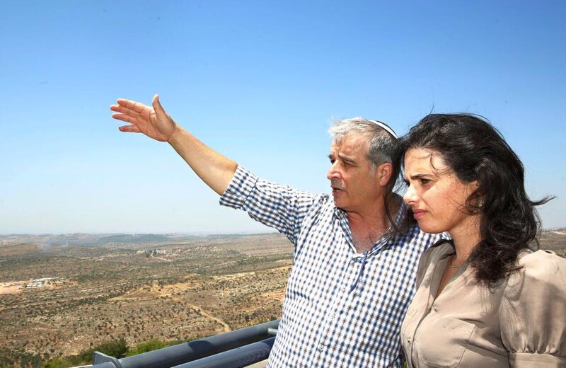 Ayelet Shaked, right, tours Israeli colonies in the occupied West Bank with settler leader Avi Roeh. (via Facebook)
