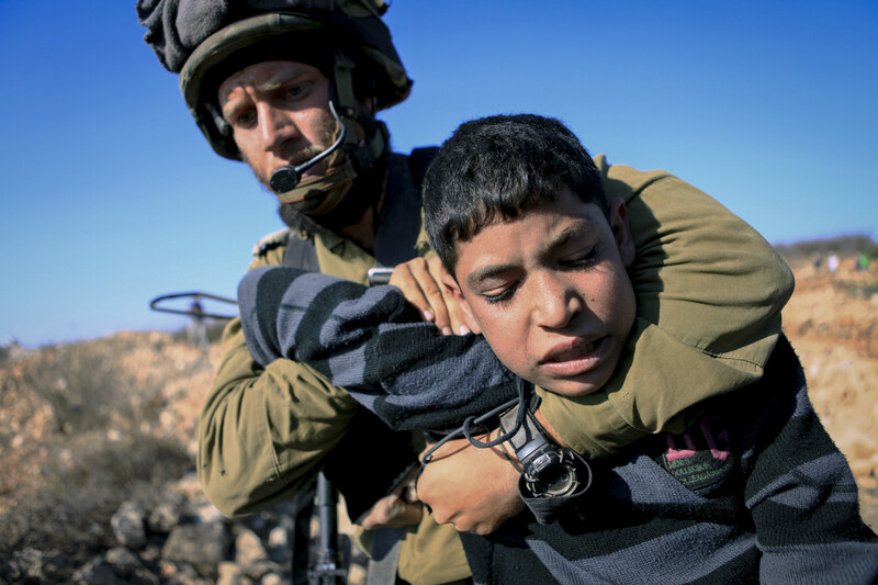 An Israeli soldier arrests a Palestinian child during a protest against the Israeli occupation and settlements in the West Bank village of Beit Ummar, 20 November 2012.