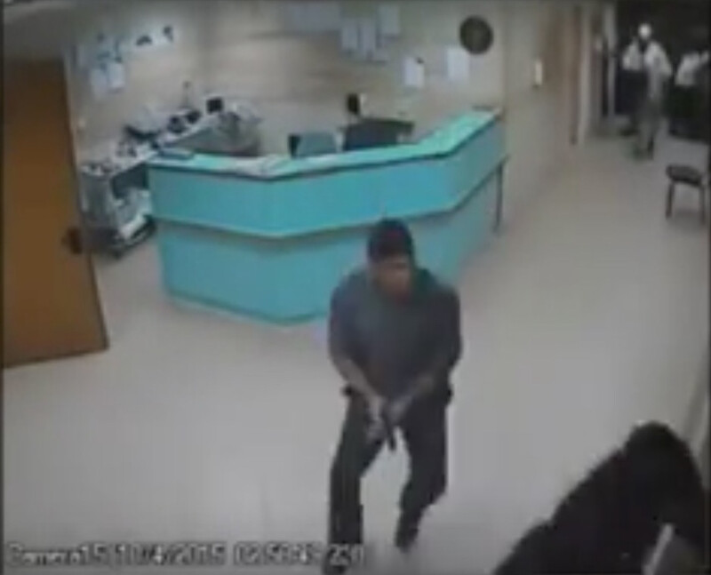 A still image from a security camera shows an Israeli agent with gun drawn at the Specialized Arab Hospital in Nablus.