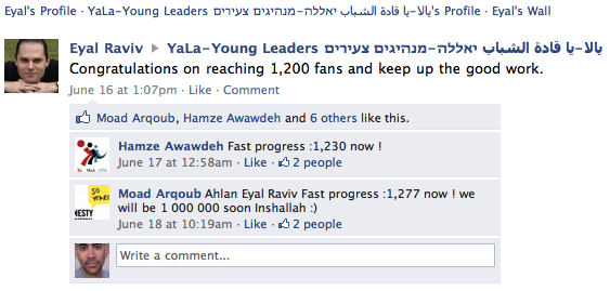 Both Awawde and Arqoub responded enthusiastically, Arqoub writing, “Ahlan Eyal Raviv Fast progress :1,277 now ! we will be 1 000 000 soon Inshallah :)” – suggestive that Arqoub felt some responsibility for ensuring the success of the page.