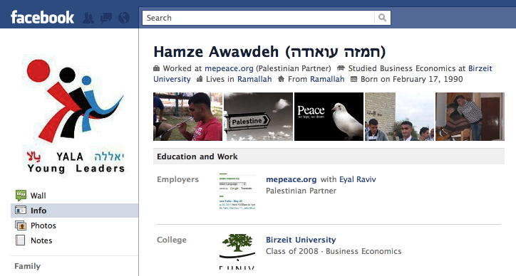 But examination of online records shows that Arqoub and Awawde are likely involved in the YaLa project, and already knew each other long before YaLa was created through their work with and participation in MEPEACE, an organization and Ning social network founded by an Israeli activist, Eyal Raviv.