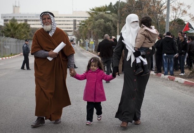 The wife, daughters and father of Khader Adnan walk out from Ziv Hospital in the city of Safed, after visiting Adnan, 15 February 2012.